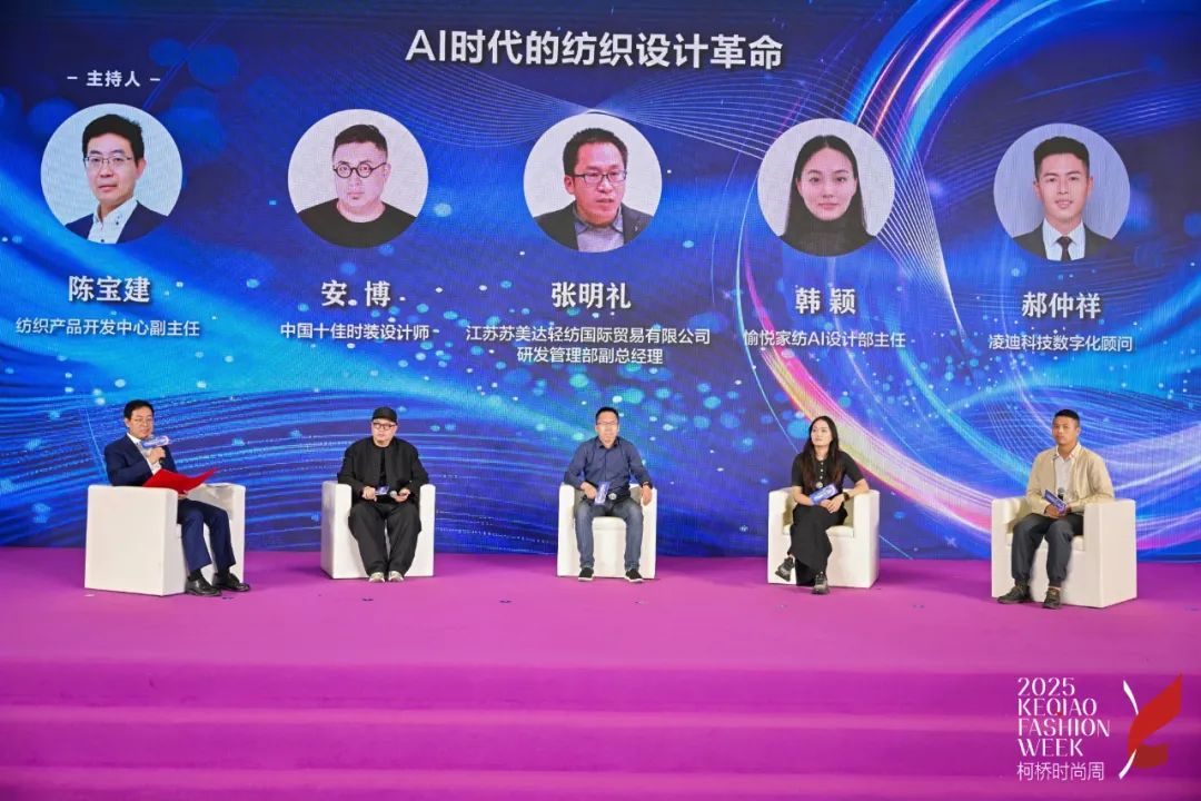 在“AI时代的纺织设计革命”主题对话环节,主持人陈宝建与四位嘉宾聚焦AI工具应用、设计创新等议题,就数智时代的纺织产品开发策略展开了探讨。
